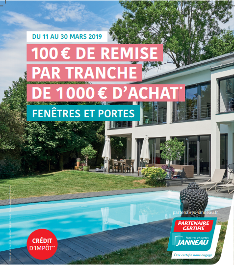 Du 11 au 30 mars 2019 : 100 euros de remise par tranche de 1000 euros d’achat* sur vos fenêtres et portes JANNEAU Menuiseries + crédit d’impôt toujours en vigueur **(selon loi des finances en vigueur).